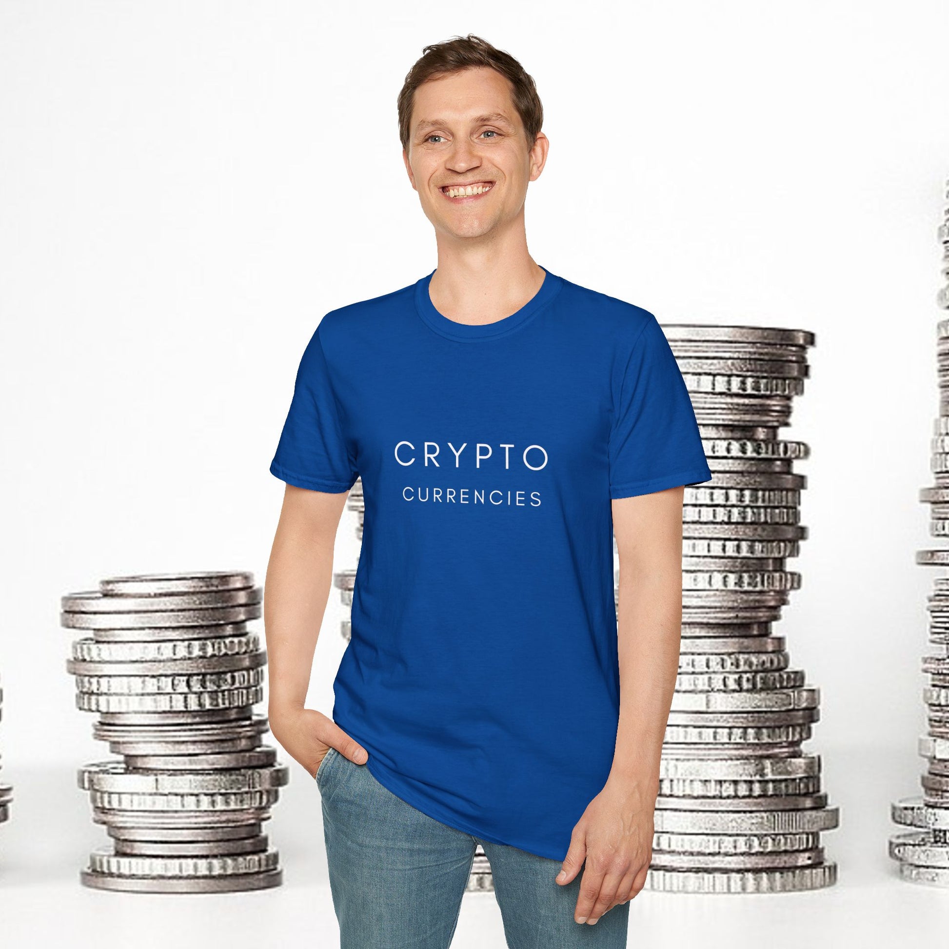 Looking to cover your torso and just under 50% of your arms? But also want to promote Crypto Currencies as a whole in a prestigious way? Well, this is the shirt for you! Displaying the words 'Crypto Currencies' in elegant white lettering, this shirt will let onlookers know that you're all in. The unisex soft-style t-shirt puts a new spin on casual comfort. Made from very soft materials, this tee is 100% cotton for solid colors. The shoulders have twill tape for improved durability. There are no side seams. And the collar is made with ribbed knitting to prevent curling damage.