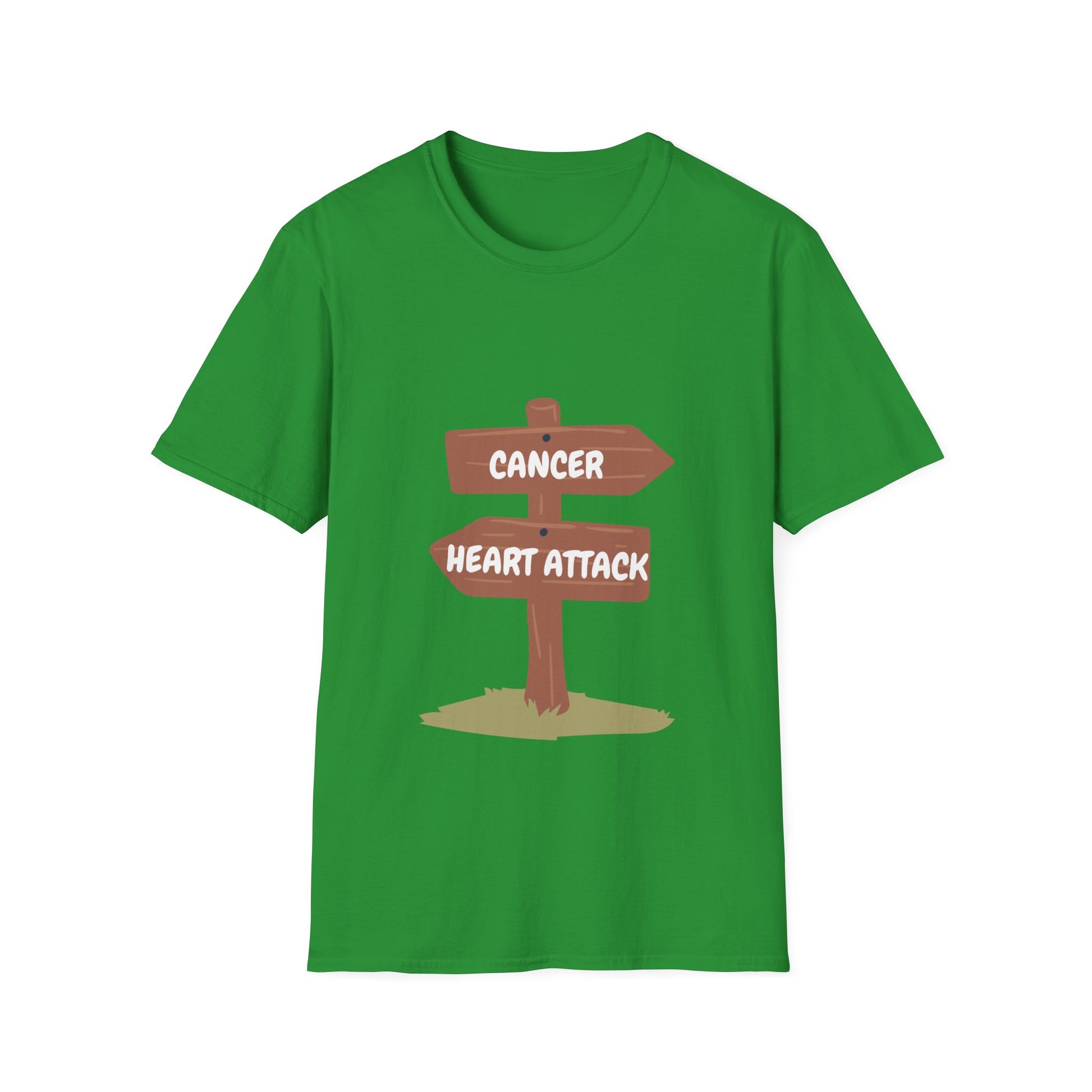 Looking to cover your torso and just under 50% of your arms? But also want to remind others of life's fragility? Well, this shirt is for you! Displaying a signpost with life's two paths on it, this memento mori shirt will keep you covered and your admirers reminded. The unisex soft-style t-shirt puts a new spin on casual comfort. Made from very soft materials, this tee is 100% cotton for solid colors. The shoulders have twill tape for improved durability. There are no side seams. And the collar is made with ribbed knitting to prevent curling damage.